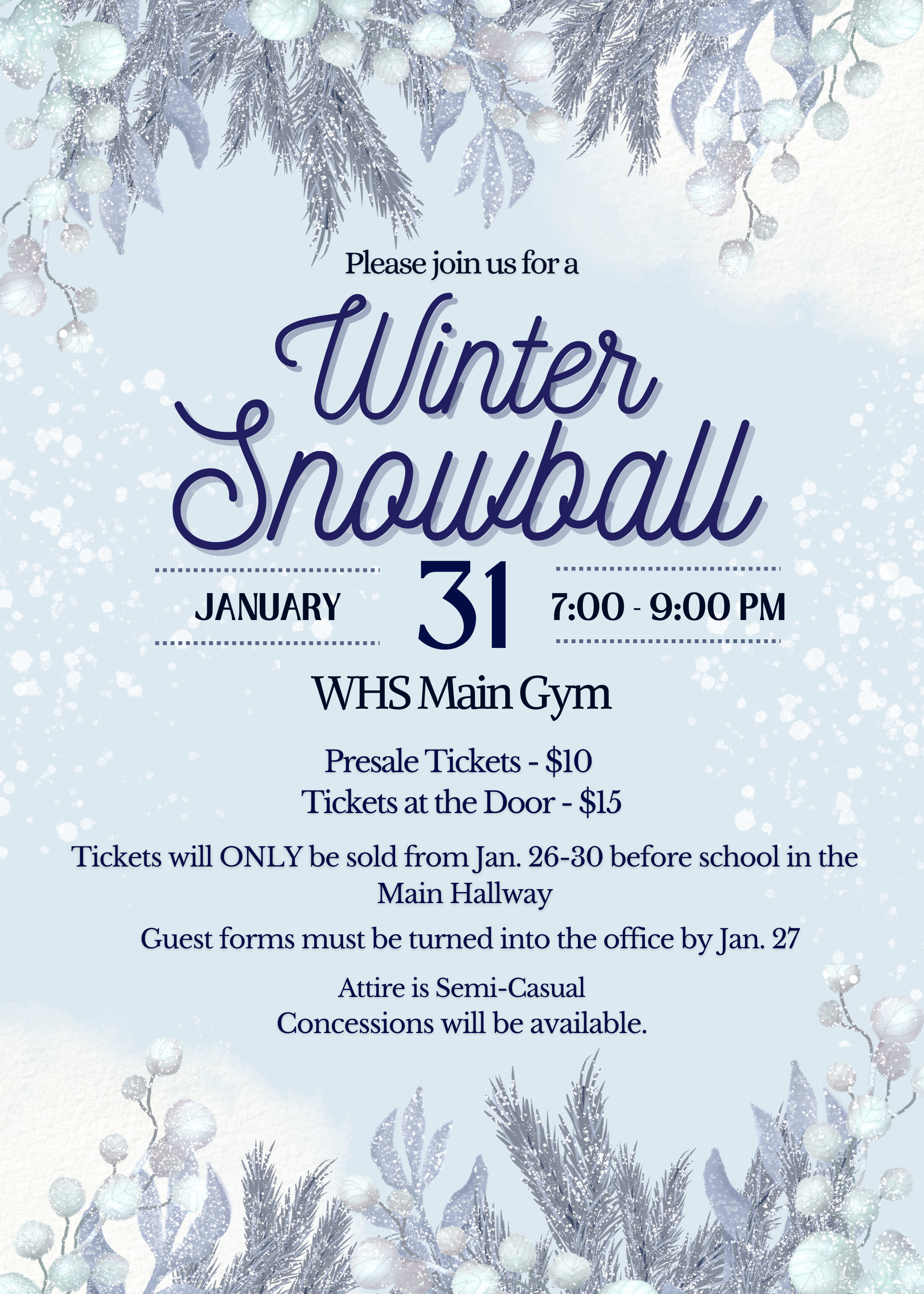 StuCo Volleyball Tournament WHS 2026 Winter Week Volleyball TournamentWHS Student Council will be hosting a Volleyball tournament for all students and staff toparticipate.All of the profits will be donated to provide needed s... January 22, 2026